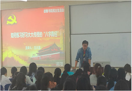 此次民主生活会以各班召开主题班会的形式举行,由辅导员和团支书在班内主持开展,在民主生活会上,同学们就如何贯彻学习“如何练好习大大传授的‘八字真经’”的问题展开深入探讨,组织我院学生对习总书记提出的“勤学、修德、明辨、笃实”八字真经进行学习,从日常生活到学习工作贯彻落实其精神内涵。
