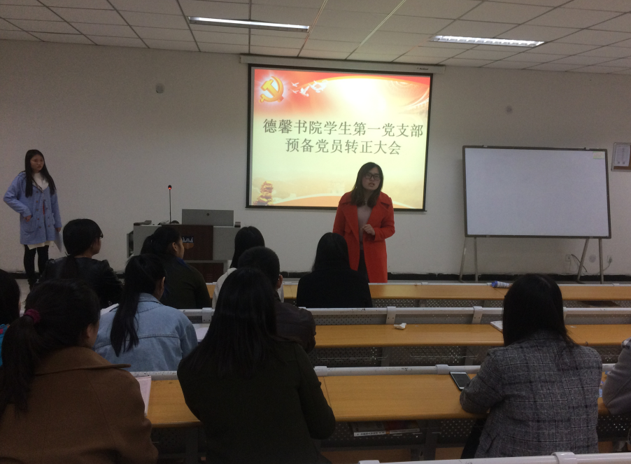 11 月 23 日,德馨书院学生第一党支部预备党员转正大会在第一教学楼 C203 教室召开,大会严格按照预备党员转正的规定流程进行,讨论尹媛媛等 4位同志的入党转正问题。此次会议由德馨书院学生第一党支部书记侯永爽老师主持,支部全体正式党员和预备党员同志参加此次会议。