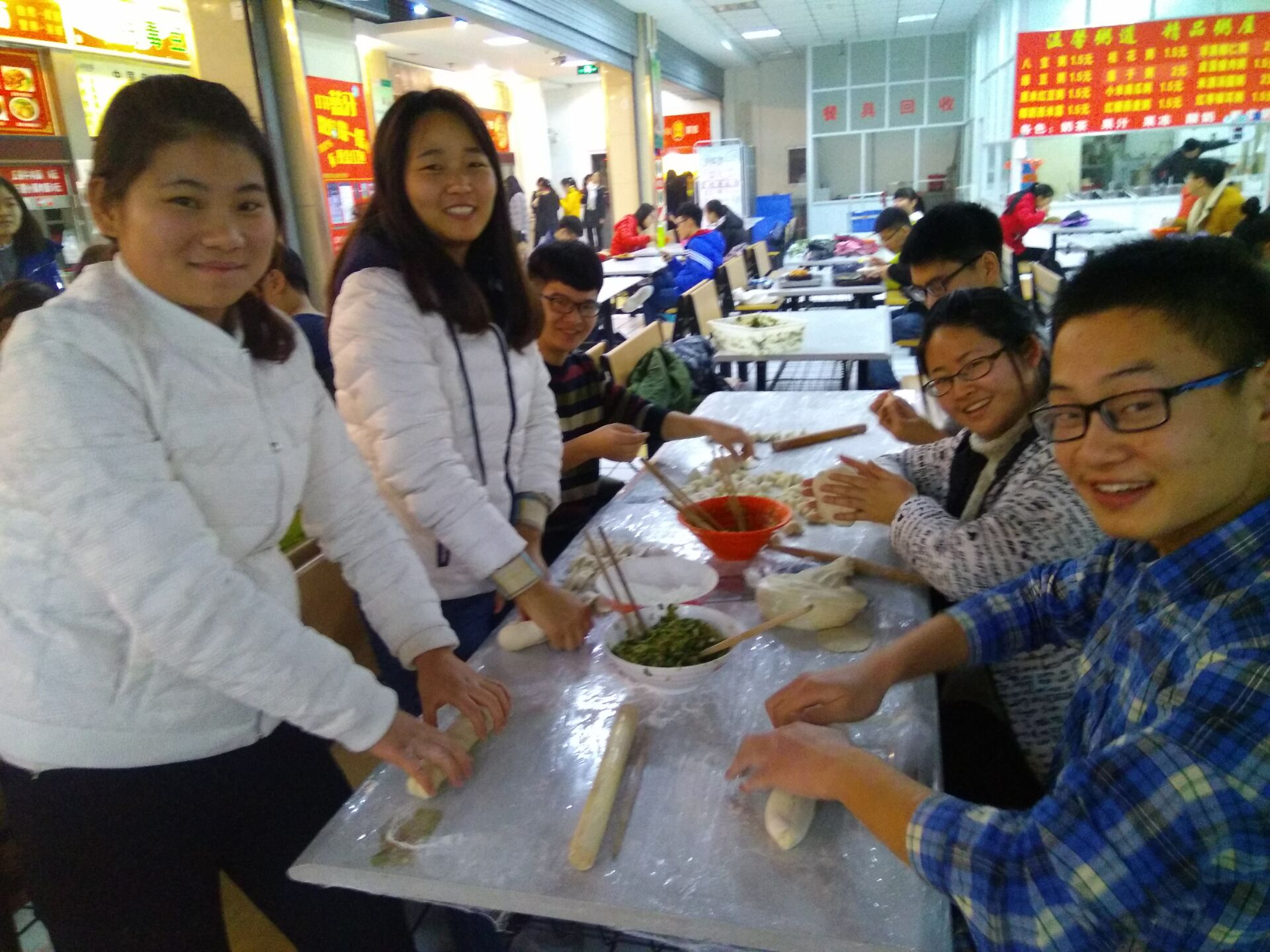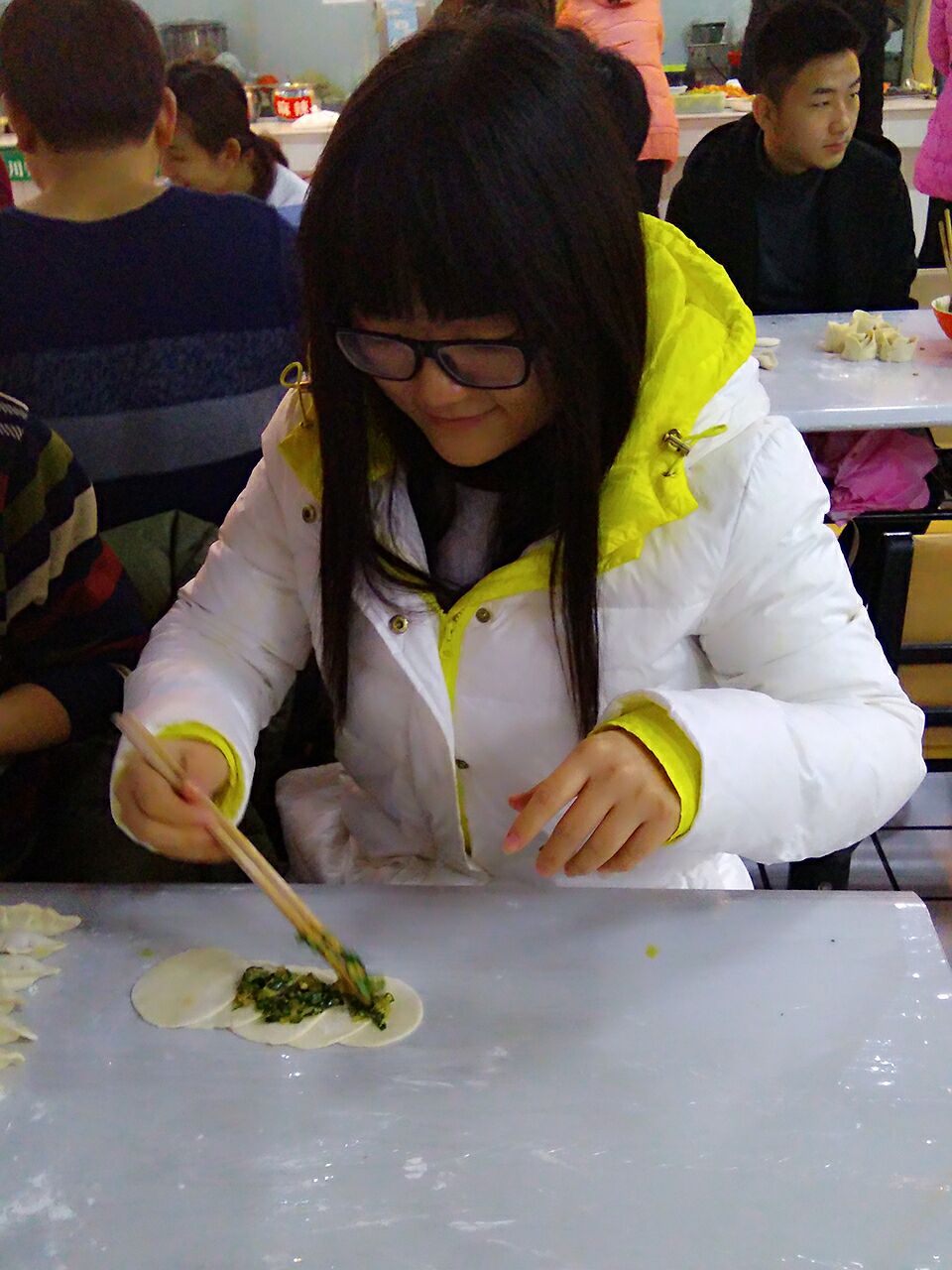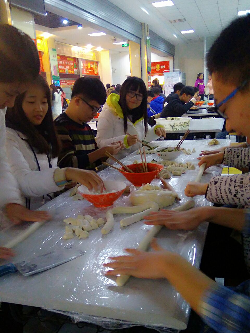当天,同学们在学校餐厅欢聚一堂,举行了和饺子相关的一系列活动。全程包括擀饺子皮比赛、包饺子速度赛、饺子创意拼图赛以及猜谜语等趣味游戏。组委会通过抽签分小组、自由组合等形式组成团队展开了激烈角逐。女同学心灵手巧,包出的饺子精美别致;男同学不甘落后,不满足于传统饺子的形状,他们试着玩起各种花样,顷刻间,涌现出了太阳花、大元宝等一大批丰富多彩、形式各异的饺子王国。看着自己包的饺子,大家的脸上都洋溢着兴奋与自豪。辅导员熊天露老师和刘璐老师也到现场为比赛助威和同学们一起娱乐。一派温馨的场面。