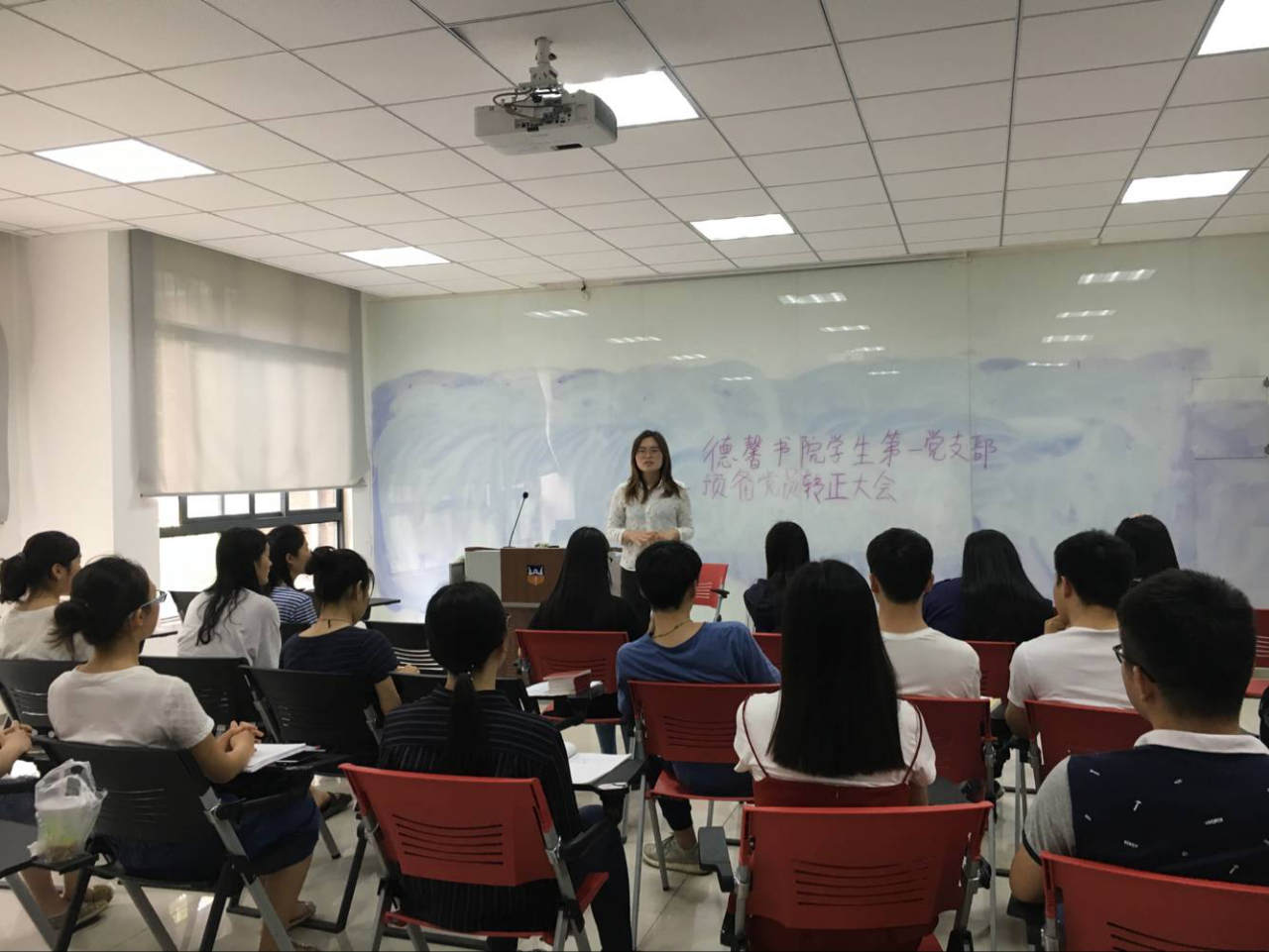 首先第一项,由主持人宣布德馨书院学生第一党支部预备党员转正大会正式召开,到会正式党员人数超过支部有表决权的党员的半数以上,符合规定。第二项,由两名预备党员依次宣读了自己的转正申请,并针对自己在预备期期间的思想、学习、生活情况向党组织做了具体汇报。之后,每一位预备党员的两位入党介绍人分别介绍该同志在预备期的表现状况。 第三项,参会的正式党员依据预备党员的综合情况进行了讨论,并经正式党员举手表决两名同志的转正申请全票通过。