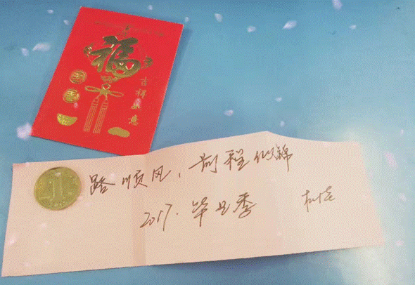 这是一场不同寻常的班会,辅导员杜佳以改编的《成都》歌词进行开场,说明了本次班会的主题与目的。接着,杜佳老师播放了一组精心制作的ppt,回忆了大家从豫北国防教育基地军训到即将毕业毕业各个时期的故事,大家用心地看着一幕幕的屏幕在切换,感受到时间的流逝,不禁泪眼朦胧。在班会中,杜佳老师为同学们准备了一个惊喜,他瞒着大家提前做好红包,每个红包里都有他亲手写下的毕业祝福附上一枚一元硬币,把红包做成心形展板,饱含深意。会上,杜佳老师讲述了自己在大学生活中的种种经历,通过多媒体,以文字形式向大家展示,并和大家交流了自己的感悟和体会,告诫同学们毕业后要珍惜自己的青春时光,努力学习,努力提高自己各方面的能力和素质,在人生之路上无所畏惧。整个过程中,师生交流气氛融洽。本次主题班会获得圆满成功。最后,杜佳老师告诉同学们“未来的路,还需要去摸索,要勇于走出自己的路。希望未来的路上你们可以仰起头,披荆斩棘!以后的日子,请放下手机,去多读一本书,多看一个人,给更多的人一个微笑。”班会在感动与不舍中悄然落幕。