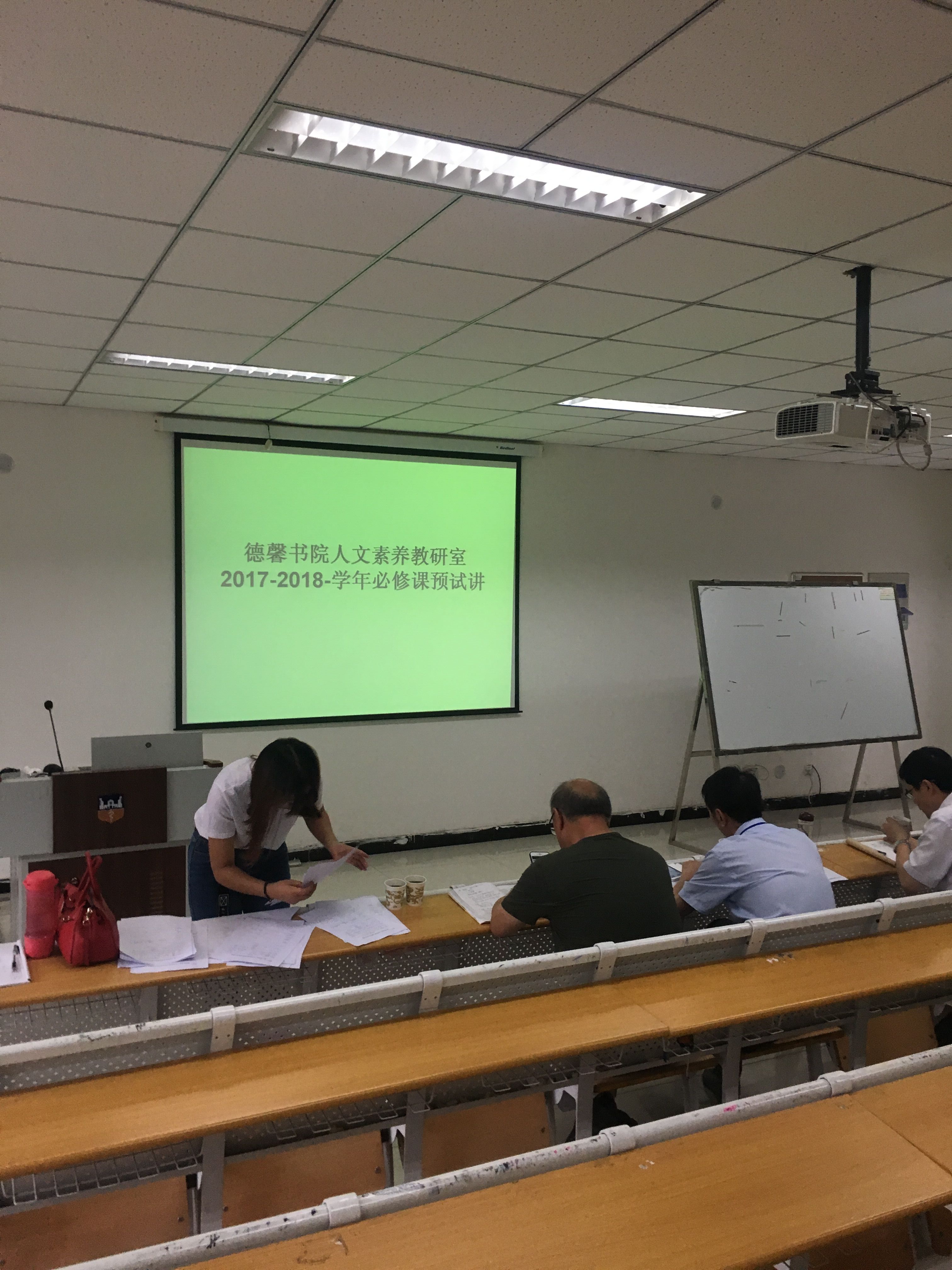 6月23日,德馨书院人文素养教研室在C103教室举行2017-2018学年第一学期通识教育必修课《医学伦理学》和《大学生安全教育》的预试讲,本次预试讲由德馨书院教研室主任主持,刘巨源等三位教授担任评委,人力资源部、学务部、教务部的老师共同参与,共有9位老师参加预试讲。