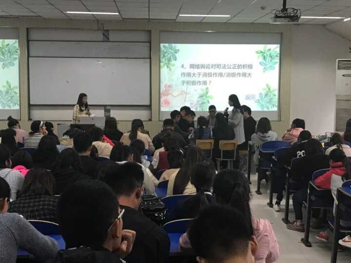 比赛开始之前,主持人先说明比赛规则,随后随机分组。每组都分为正方和反方两队,各组的参赛人员拿到试题后,都成竹在胸,迅速表明自己这一方的观点,双方辩手你来我往,侃侃而谈,场下的同学激情澎湃,掌声连连响起。