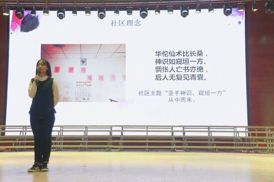 晚上18:30 “第四届陋室文化节闭幕式既社区风采展”在闻德礼堂圆满举行。活动第一环节,以中国古代名医命名的各个社区区长针对自己社区的名字、来源及设计理念进行了解说。该环节为我院学生更深入了解医学人物、创造更高质量的社区生活、书院生活打下了坚实的基础;活动第二项由各个社区进行独特新颖的社区歌曲展示,各个社区分别以多形式小合唱的形式演唱各个社区代表歌曲,从《我的太阳》到《追光者》,从《小幸运》到《爱一点》,各个社区歌曲精彩纷呈又富有三全特色,其中《在德馨南四楼的日子》获得同学们的阵阵掌声。