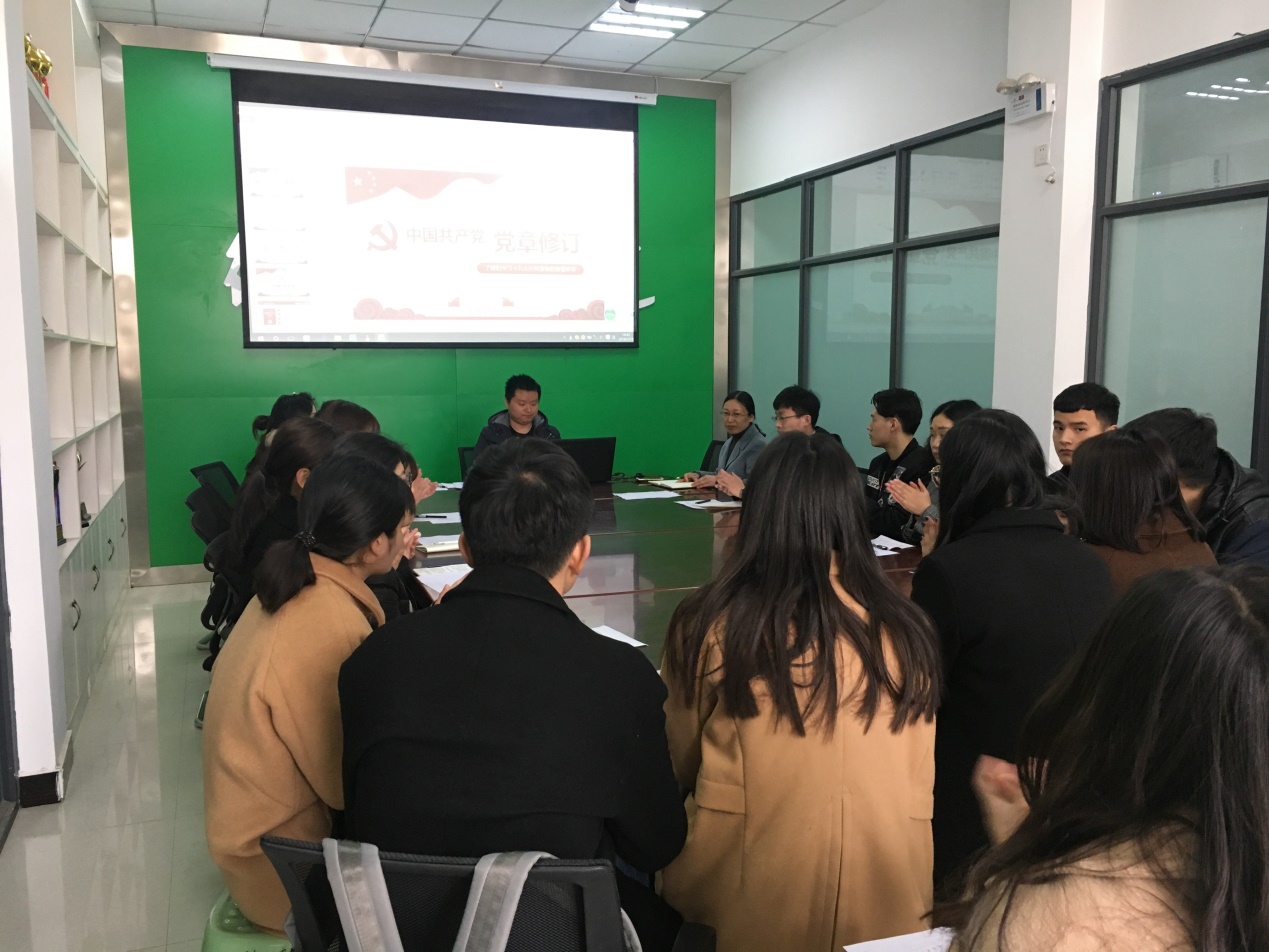 会议中熊天露老师说道:“作为一名党员要深入贯彻学习习近平总书记的重要讲话及党的十九大精神,正确理解党在新时期的路线、方针和政策,坚持对马列主义的信仰,牢固树立共产主义理想,解决好在新形势下,使自己的思想更加符合实际,符合时代发展要求,保持与时俱进。树立正确的世界观、人生观、价值观,发挥好党组织的政治核心作用,战斗堡垒作用及共产党员的先锋模范作用。”