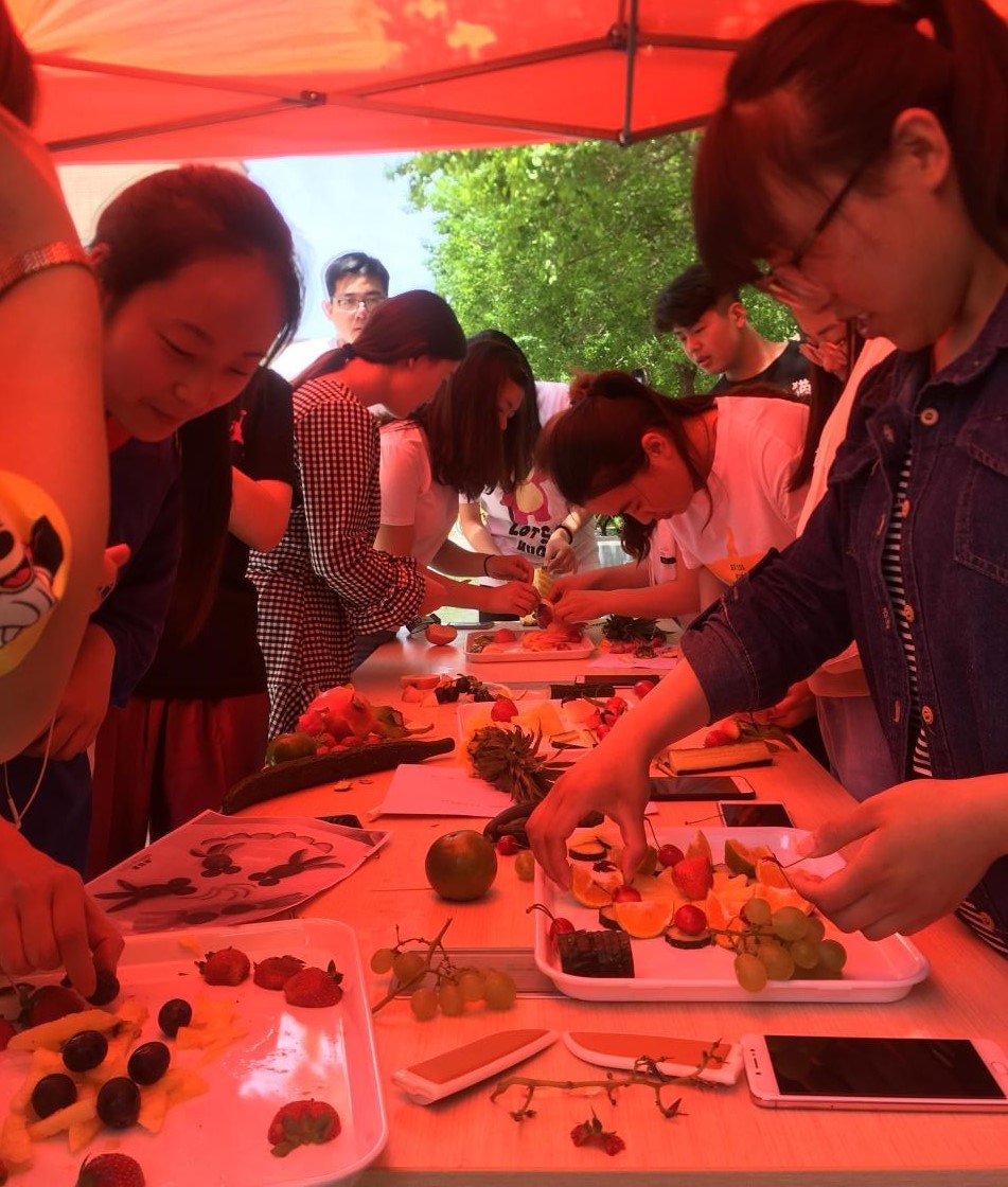 活动现场井然有序,热闹非凡。活动共分为两个环节,第一个环节需要大家在规定的时间内完成自己的作品,第二个环节,参赛小组需要对自己的作品进行阐述。活动进行期间,有的小组忙着切水果,有的小组在急着讨论创意,同学们相互配合,各抒己见,热情洋溢地在有限的水果和空间下,发挥各自独特的想象力和团队合作能力对水果进行雕刻、拼接。高涨的气氛引来了大批同学的围观。在主持人宣布比赛结束后,每个小组上交了作品,接下来进入作品介绍环节。从同学们创意满满的作品中,可以看出大家对生活的思考。第一组同学制作的“城市丛林”,运用心理学家阿德勒的“社会意识”观点,展现出人的社会属性,人们需要进行交往,相互依赖,相互合作。第二组作品“展翅飞翔”,表达了同学们对能够在大学里活出自己,展现自己,步步展翅,步步飞翔的美好祝福。第三组作品“缤纷彩带迎幸福”,利用不同颜色的水果巧妙组合,营造出一幅色彩斑斓的画面,意味着生活的多姿多彩与美好。而本次获得一等奖的作品是“心心相映,援解囚笼”,用蓝莓、圣女果、草莓和菠萝拼出了失落的心被一颗大大的红心所笼罩,寓意着人与人之间用真心和顺相待,多关心他人,生活会更加甜蜜。