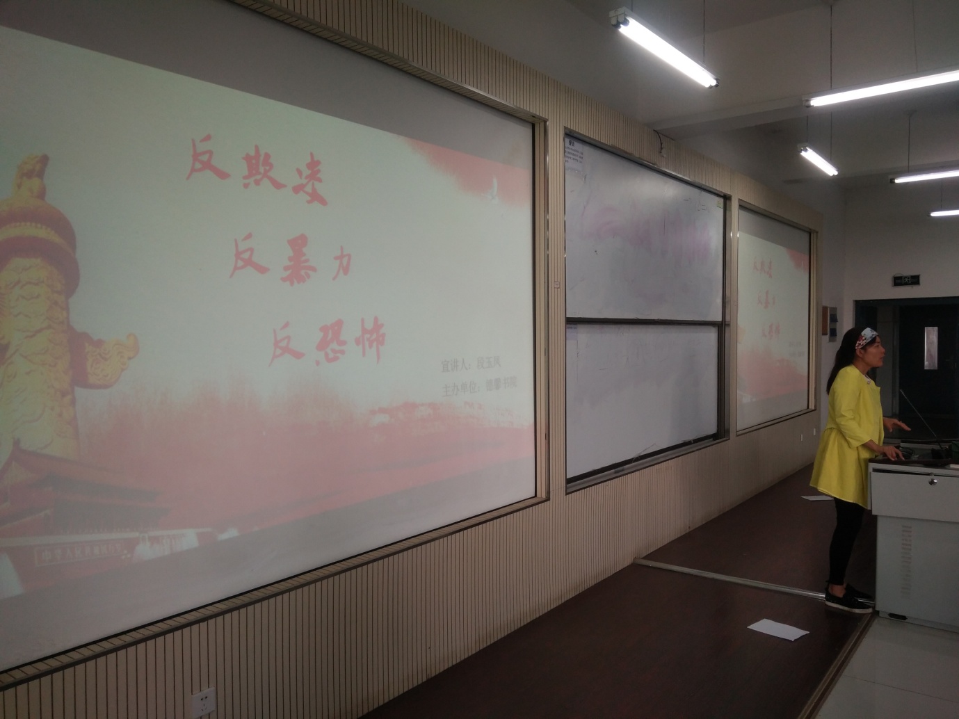 活动第一环节,由主持人致开场白,宣布活动开始,并简单介绍段玉凤老师与开展此次活动的目的。活动第二环节,段玉凤老师进行“反欺凌 反暴力 反恐怖”的主题讲授。段玉凤老师以案说法,结合典型案例与视频,以通俗易懂的语言讲授了校园欺凌的危害及法律后果,进一步警示同学们反对校园欺凌,远离违法犯罪,还校园一片净土。活动圆满结束。