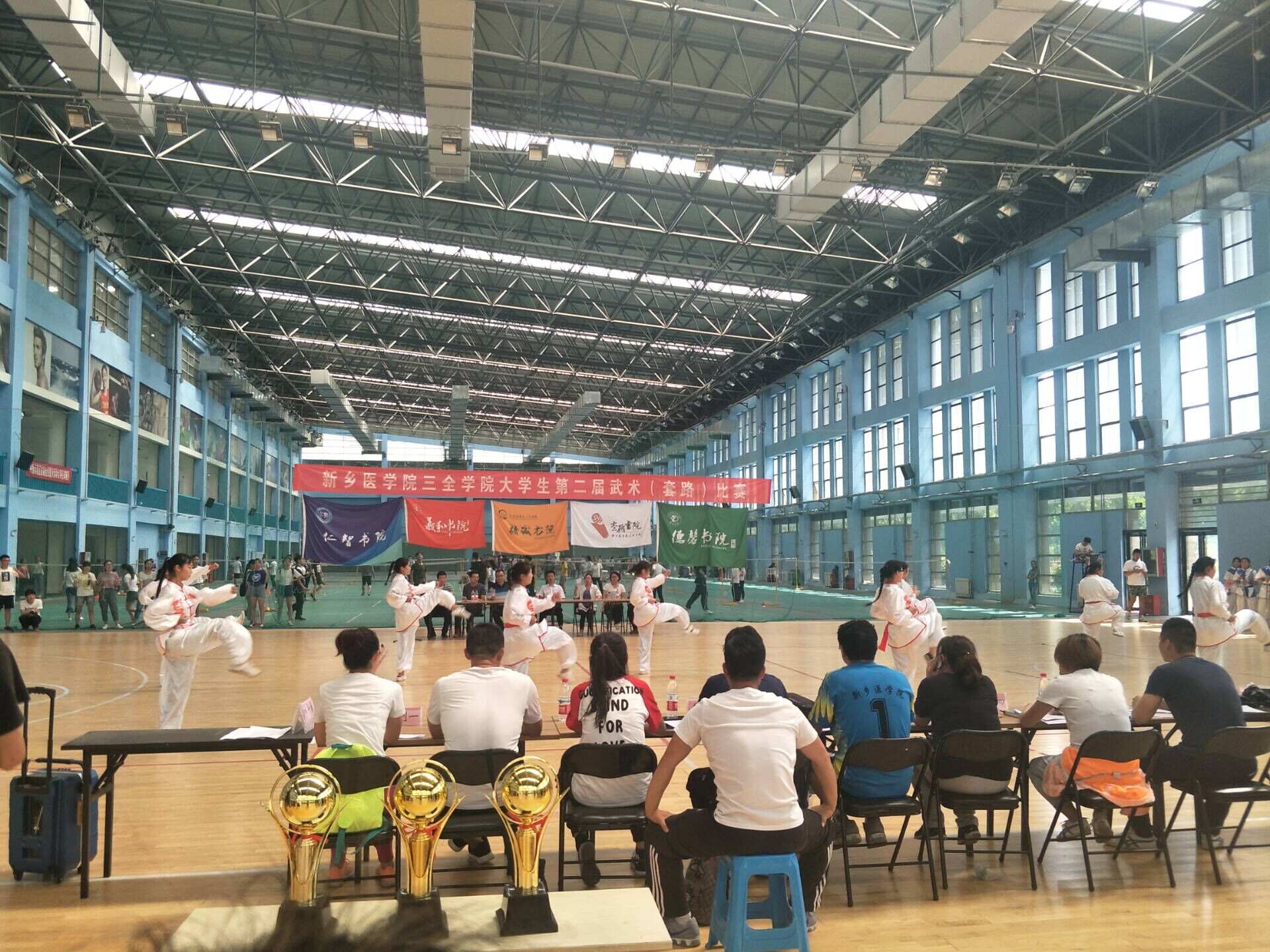 6月6日大学生第二届武术比赛在新乡医学院三全学院平原校区综合训练馆举行。本次活动由新乡医学院三全学院体育部主办,由体育部武术与体操教研室承办。参加此次活动的人员有五个书院的参赛选手,每个项目的比赛成绩由体育部老师与领导为其打分。