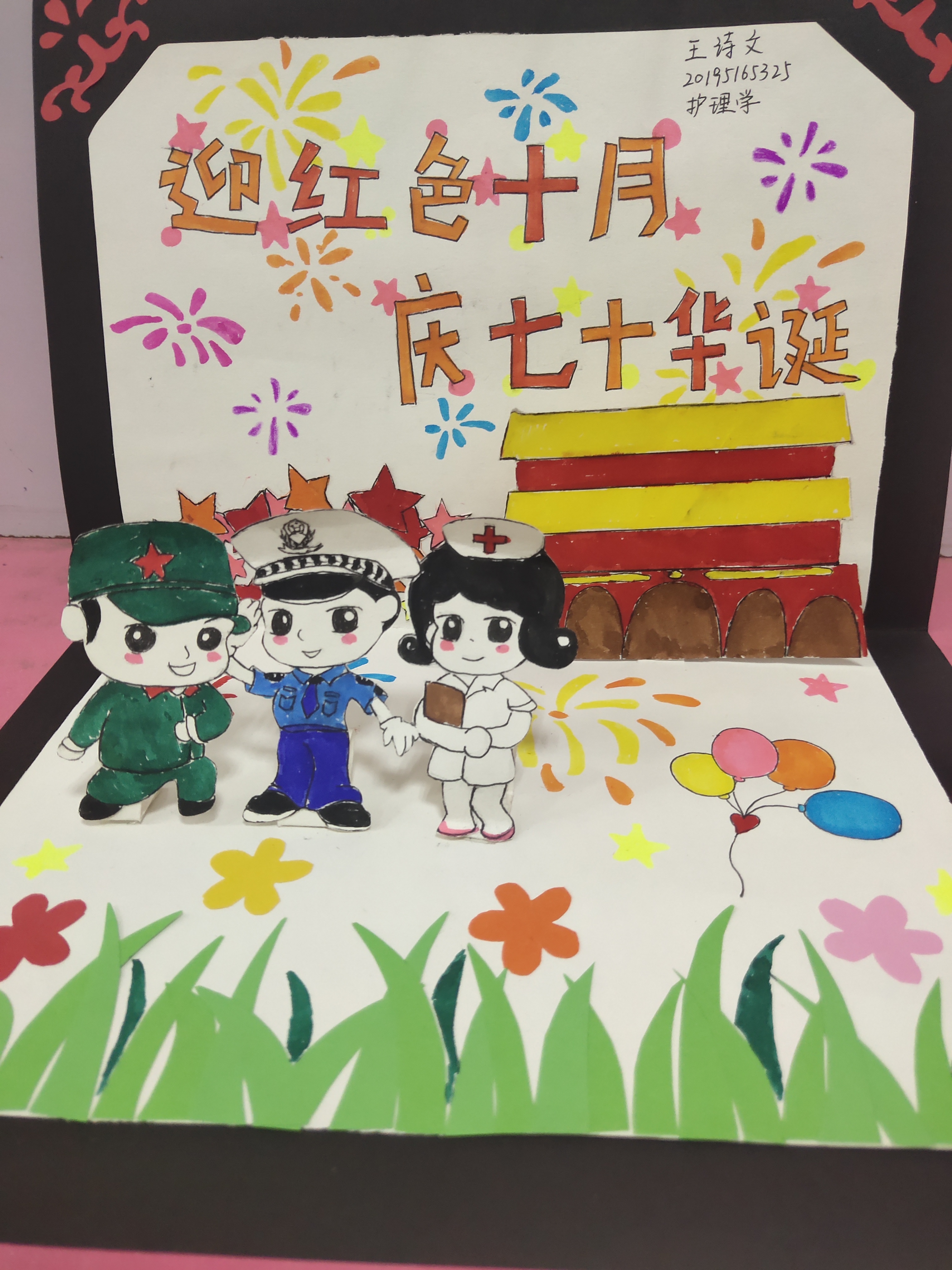 本次活动共分为两大部分:于十月二十五日正午报道进行签到报名,报名后在课余时间制作关于中国知名爱国人物或知名建筑的立体贺卡,并与十月二十七日正午上交作品并由宣传部收集后展出。本次活动开展前就在同学之间获得了广泛的交流讨论,在活动开展当日更是有许多同学早早前来排队参见。本次活动不仅锻炼了同学们的动手能力,更是以独特的方式增长了同学们的红色知识,提升了同学们的爱国情怀和精神文化内涵,为红色文化的传承进一步奠定了基础。同学们做的立体贺卡栩栩如生,军人、医生、警察在天安门下敬礼,天空烟花绽放,祖国七十华诞,举国欢庆!