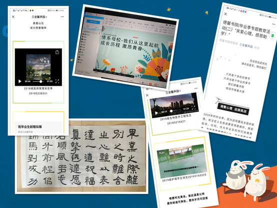 随着学长学姐们的离开,非毕业生同学们也通过录制短视频、唱歌、书法或图画等多种形式,期望在离别之际为他们送上一份温情,传递一份温暖。同时,毕业生同学们也通过文字、照片、微电影等形式记录在校生活中的点点滴滴,回忆时光,分享自己的学习经验,表达自己的毕业感想。通过书院微信公众号毕业生专栏展示给全体同学们,引导大家珍惜学校的学习生活,感受母校的温暖、同学的友谊、教师的关心。