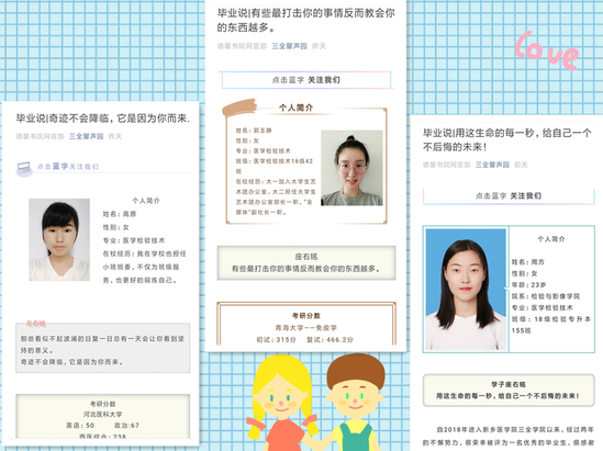 德馨书院依托“三全馨声园”微信平台,通过“毕业说”“青春不散场”等专栏吸引在校师生参与毕业话题讨论,制作推送《毕业生感悟》《致敬祝福》等毕业季视频,营造温馨的网上毕业季氛围。其中《毕业生感悟》引导毕业生用影像记录关于母校的点滴回忆、一草一木,培养他们爱校荣校的深厚情怀;“毕业说”邀请优秀毕业生分享考研、学习、就业经验等,为低年级学弟学妹们答疑解惑,声声祝福传递德馨情,青春接力谱写新篇章。毕业班辅导员通过开展线上主题班会的形式,对毕业生进行爱国主义教育、理想信念教育、遵纪守法教育,引导毕业生做一名有责任感、有担当精神的优秀毕业生。辅导员老师们充分运用抗击新冠肺炎疫情鲜活事例,如郝莺歌、周小宝等等我校在疫情期间表现优秀,做出相当贡献的学生、校友,深入挖掘在抗击新冠肺炎疫情斗争中展示出来的爱国主义精神的新内涵,融入到毕业生最后一次班会中,引导青年学子要主动投身党的伟大事业,融入国家发展大局,到国家需要的地方、人民需要的地方就业创业,扎根人民、奉献国家。
