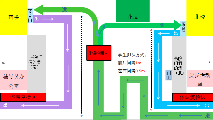 实习生返校前期,德馨书院持续对实习生开展健康状况监测,实行“零报告、日报告”,做好实习生返校途中以及返岗的疫情防控教育。8月11日至8月14日,清晨的阳光洒进德馨书院,德馨书院全体教职工就已经全员待命,迎接实习生的到来。分批返校的实习生到达德馨书院门洞后,持身份证、学生证、健康码和新型冠状病毒咽拭子核酸检测报告,在宿舍门洞内外排成U字形通道排队(间隔1米)接受体温检测,体温检测合格后方可进入宿舍,并在入校后封闭管理,于次日乘坐实习生接送专车由辅导员送至南阳、三门峡、平顶山、洛阳、漯河、郑州等地的实习医院。