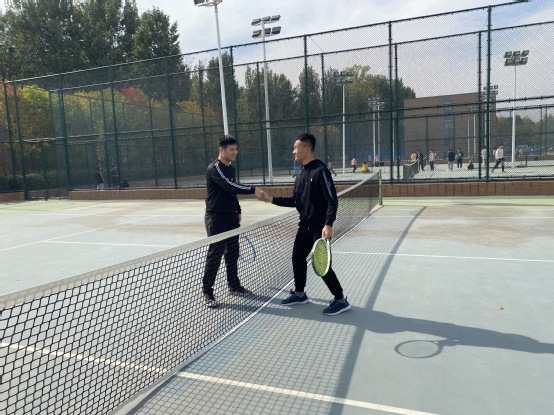 11月3日,中午12点,第四轮男子网球比赛在体育场内即将开始。交战双方是德馨书院的男子网球队和精诚书院男子网球队。