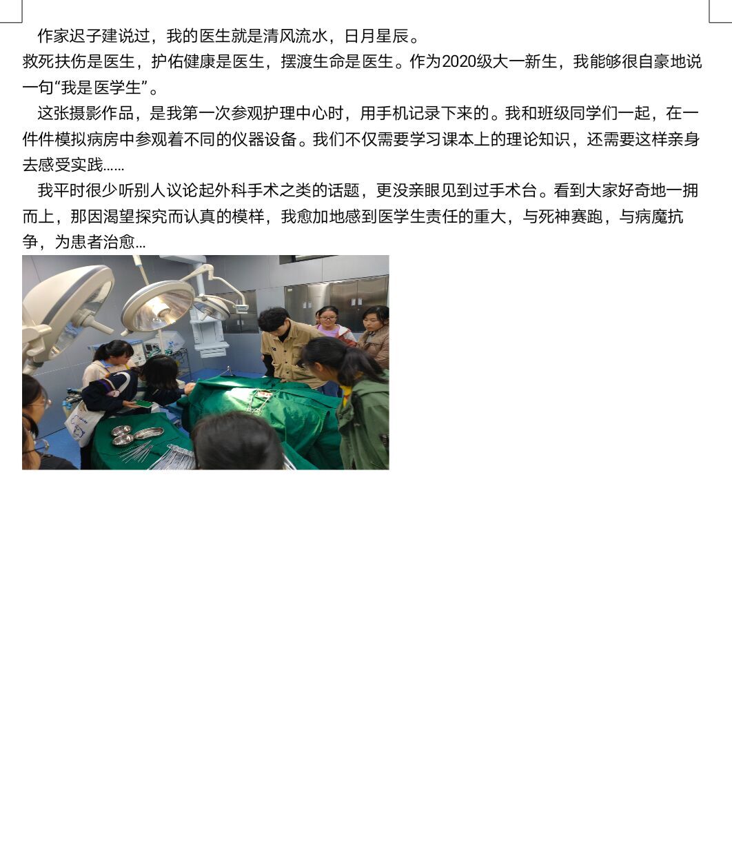 活动报名期间,同学们积极配合并到通过大班长发布的通知进行扫码报名,工作人员认真整理活动参加人员信息,为活动的顺利进行做好了前期的准备工作。“我是医学生”活动贴近生活,目的是通过摄影和文字的方式,让同学们能够更加深入了解医学生,增强学生自身自信心的培养,明白身为医学生的责任。活动开始后参加活动的同学便开始用心准备作品,开始收集我们生活中的碎影,按照活动要求拍摄与医学生有关且符合社会主义核心价值观及抗疫精神的画面清晰的摄像作品,并展现他们的文采,附上自己对自己身为医学生的感受,最后将自己的作品上传至活动群中。工作人员与参赛者保持沟通,确保活动的顺利进行。为确保活动参赛作品真实有效,工作人员在后台进行监督,并对参赛内容进行了筛选,最终,工作人员选择出多项优秀的作品,并对这些优秀的作者进行校级学时奖励。