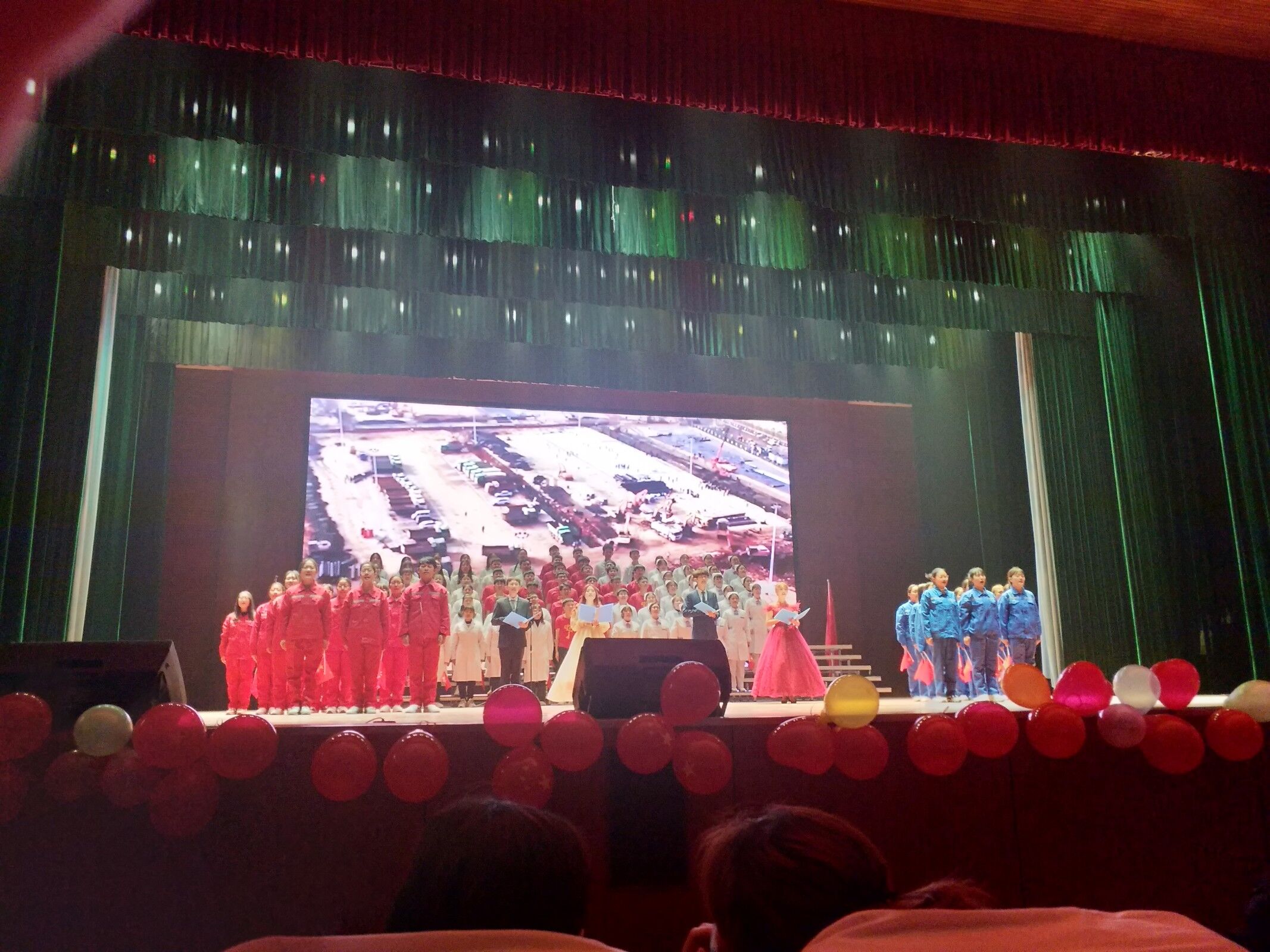 四个领诵人员上场了。一句一句,用声音描绘抗疫那时的画卷。“你要去哪”“武汉!”百人异口同声,一瞬间带领观众回到2020年这个注定不凡的春节。他们的声音铿锵有力,他们的眼睛坚定有神。当他们读到“坚强靠山”时,左右方队整齐地伸出右臂。当他们读到“一个个鲜红的手印”时他们的手印也伸向空中。在描述事情时,他们的声音如溪水般平静缓和;在表达对医护人员的敬佩时,他们的声音如雷声般震耳。他们用他们的有力的声音和整齐的动作让观众再次看到了医护人员的伟大事迹,感受到了抗疫英雄的无畏。百人诵读诠释了新时代最可爱的人,诠释了伟大的抗疫精神。
