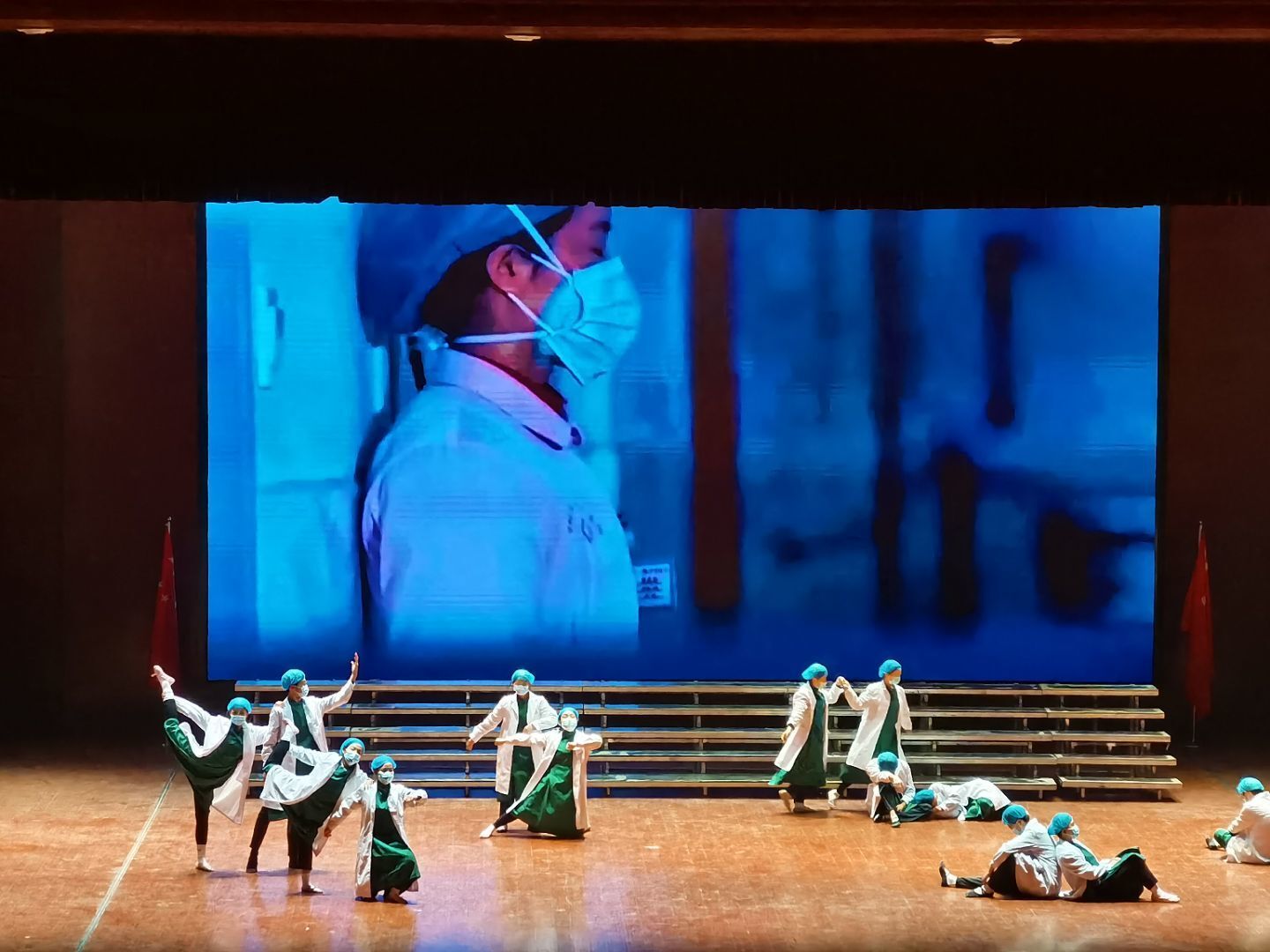 第二个环节是才艺表演。德馨书院的舞蹈名字是《为民逆行》。灯光照亮舞台,十六个身穿手术服白大褂带着口罩的舞者缓缓抬头,整齐划一的动作卡着每一个节拍。他们眼里有光,动作时而柔时而刚。“哇,好棒!”一阵叫好声。不断变幻的队形,紧张的步伐,准确表达了医护人员严谨无惧的精神。心肺复苏,打点滴这些本是医护人员的专业动作,也被创造性的改编成舞蹈动作。“噔噔噔”紧张的节拍与举人动作完美结合。再次赢得一阵叫好声,惊艳的举人动作为这舞蹈增加了浓墨重彩的一笔,果然是一场视觉盛宴!