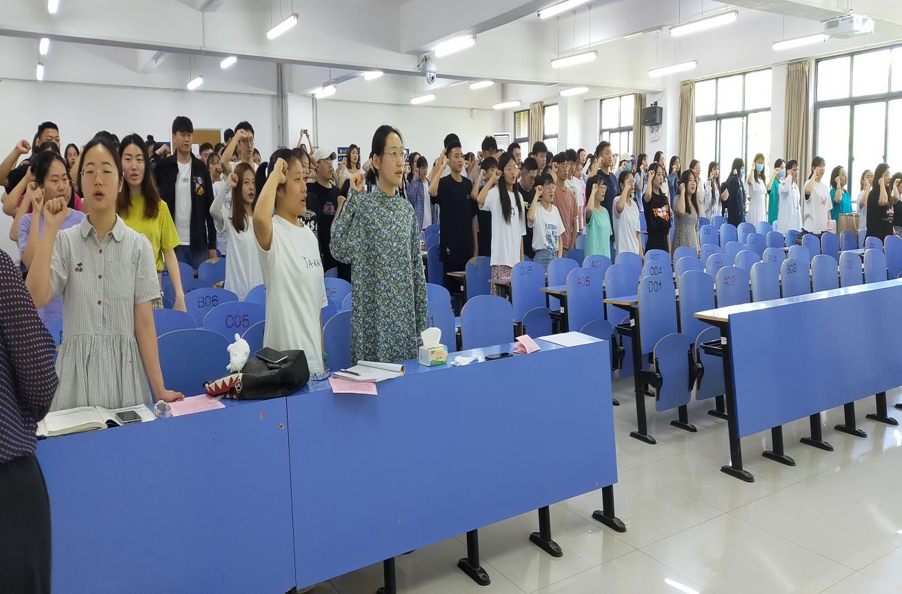 “五个一”活动即召开一次“诚信考试从我做起”主题班会,辅导员组织应考学生集中观看一次诚信教育宣传片,开展一次诚信考试宣誓活动,签订一份诚信考试承诺书,开展一次考生“无声入场”模拟演练。“五个一”工作的开展,使得考生进一步提高对诚信考试的认识,自觉培养诚信考试的优良品质。活动前书院积极利用广告机、宣传栏、“两微一端”等途径广泛宣传诚信的意义,组织考生签订诚信考试承诺书,承诺营造一个良好的考试氛围,强化考生对诚信考试重要性的认识。同时,结合诚信教育主题班会深入讲解考试注意事项及强调诚信考试的意义。会上,书院组织全体考生观看《刑法修正案(九)》小视频,让考生充分知晓作弊后的严重后果,2018级专科护理5班常欣祥带领全体考生进行诚信宣誓仪式,大家右手举拳,庄严宣誓:“我宣誓:自觉遵守考试纪律,公平参与考试竞争。珍惜名誉,诚信做人,诚实应考。