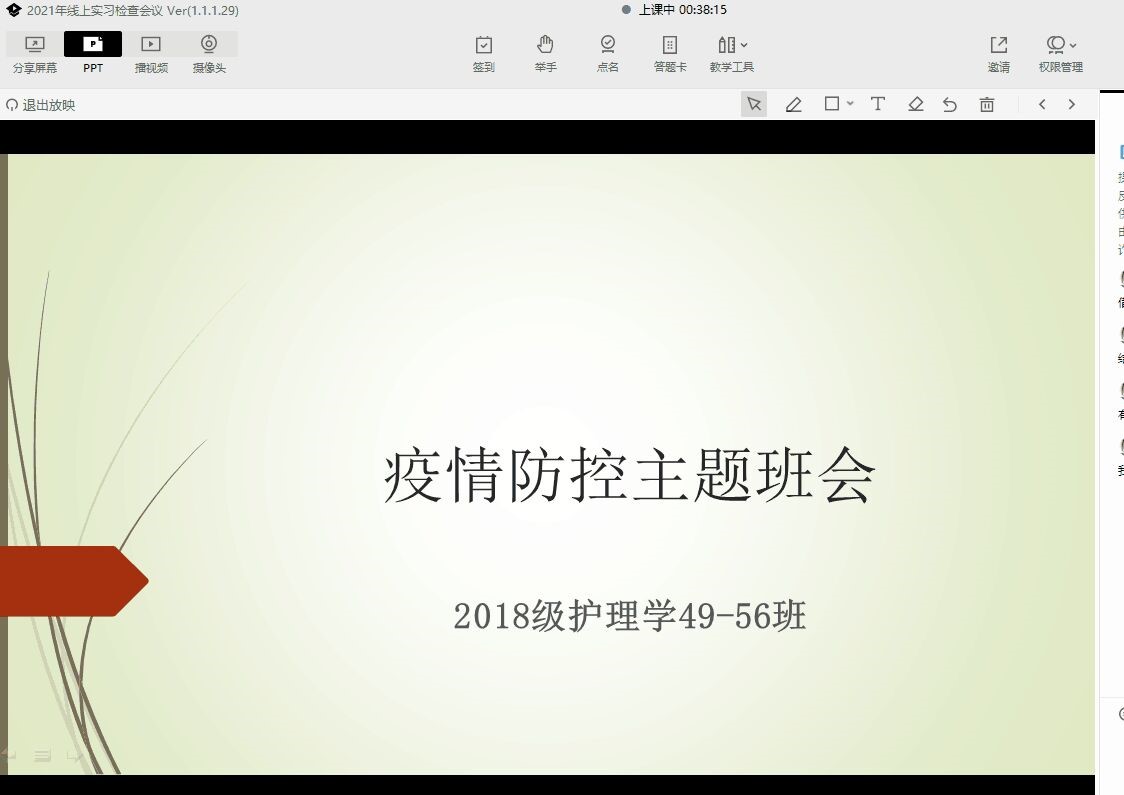 本次检查各班实习生辅导员老师从当前疫情防控方面、实习生面临的安全方面、防电信诈骗方面、对实习生们进行了宣讲。本次线上检查中,部分实习生反映反映医院假期较少,实习工作生活比较繁忙,会面临着找工作,考研等事情,希望医院能够给学生足够的时间学习。还有小部分实习生反映希望在轮转科室中能够轮到重症、手术室、急诊等重要科室。辅导员老师在实习组长座谈会中通过和学生的沟通交流,对实习生们面临的问题进行了解疑答惑。
