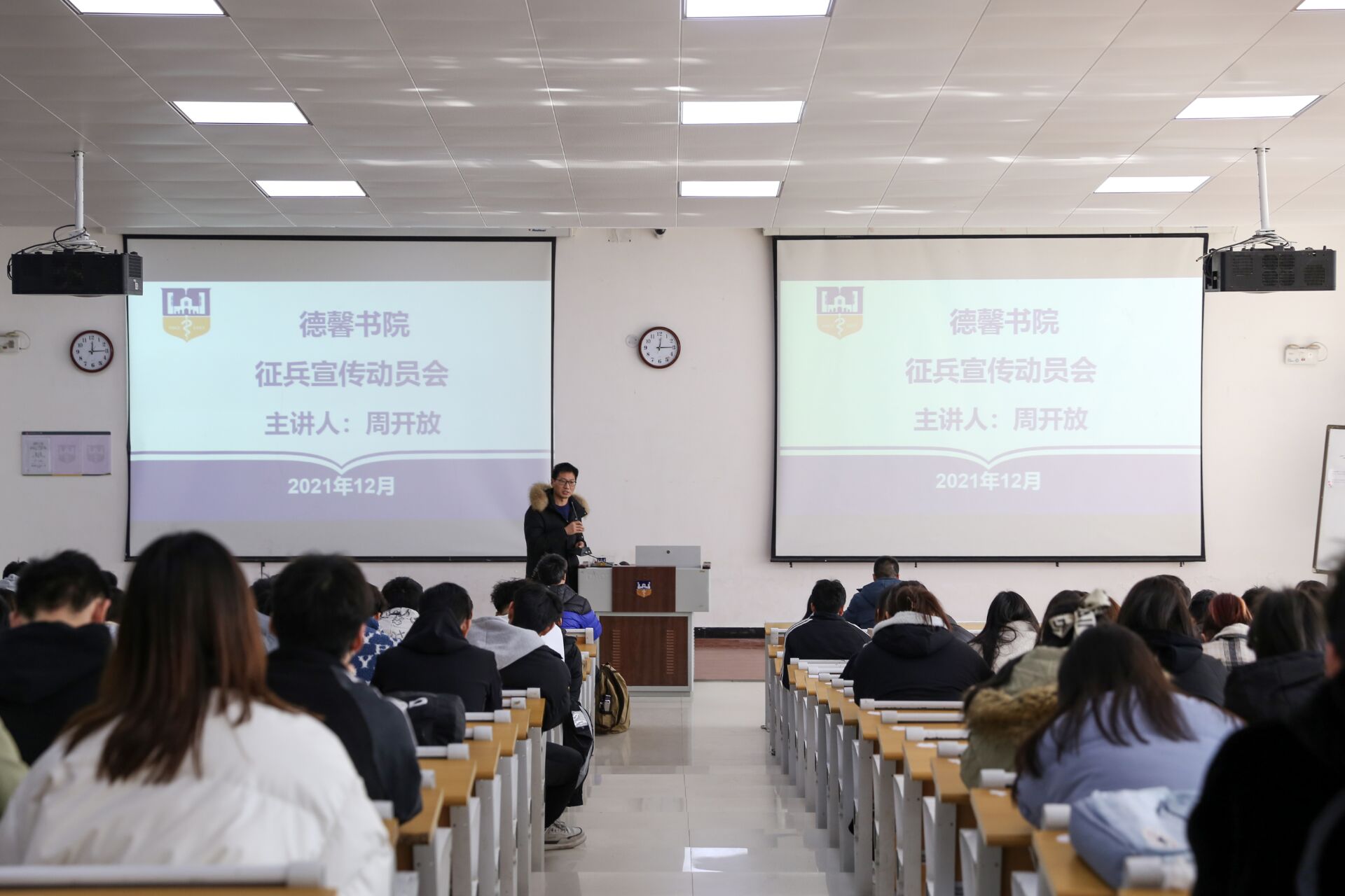 为响应国家征兵号召,厚植大学生爱国主义情怀,鼓励大学生参军强国、献身国防。12月21日,德馨书院特此开展“征兵宣讲会”。此次会议由赵心煜老师主持,大学生就业创业指导服务中心的周开放老师主讲,2021级学生参加。