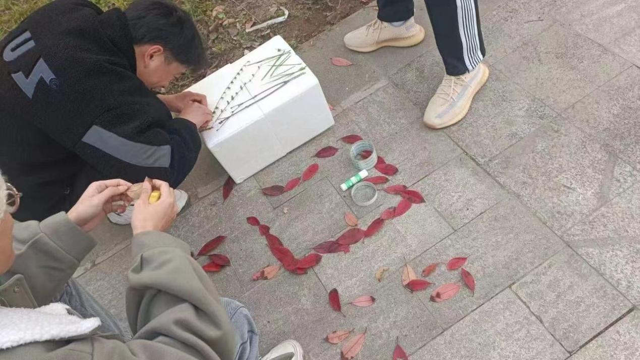 活动开始前,工作人员将志愿者们进行了分组;活动开始后,工作人员分别带领每个小组到校园中搜集材料进行作品制作。随后志愿者们携带自己的作品到操场集合,介绍自己的作品及寓意,有的志愿者将落叶有序粘贴起来,并利用卡纸做成了一个“开屏孔雀”;有的志愿者将收集来的小草和树叶以一种特别的组合方式粘到原本废弃的泡沫板上,意为“立春”;有的志愿者利用树枝和不同颜色的树叶做出了一个“常青树”。