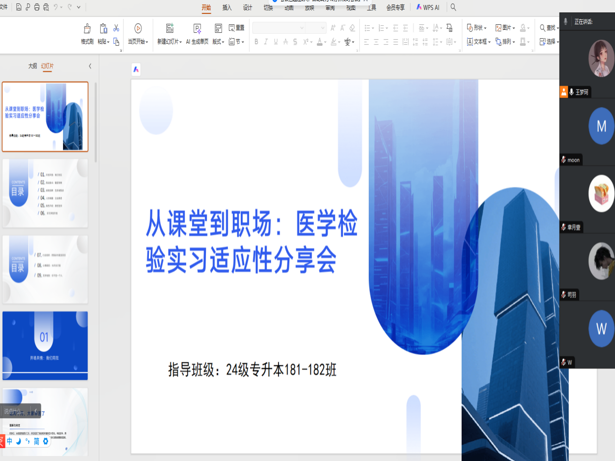 9月11日,2024级医学检验技术专升本181-182班全体同学在王梦柯老师的带领下,通过线上腾讯会议开展了以“从课堂到职场:医学检验实习适应性分享会”为主题的学业导师会。会上,王梦柯老师先阐述实习对提升职业能力、培养临床思维的意义,结合检验岗位特点指导角色转换与规范养成;随后剖析实习难题并给出应对策略,引导学生制定能力提升清单,还做心理疏导、组织交流点评,同时传授实习日志撰写要点。此次实习指导精准聚焦学生核心需求,不仅有效解答了大家在实习定位、实习期间难题应对等方面的关键疑惑,更通过清晰的流程拆解,帮助学生明确了实习适应阶段的具体步骤,为后续实习推进奠定了扎实基础。