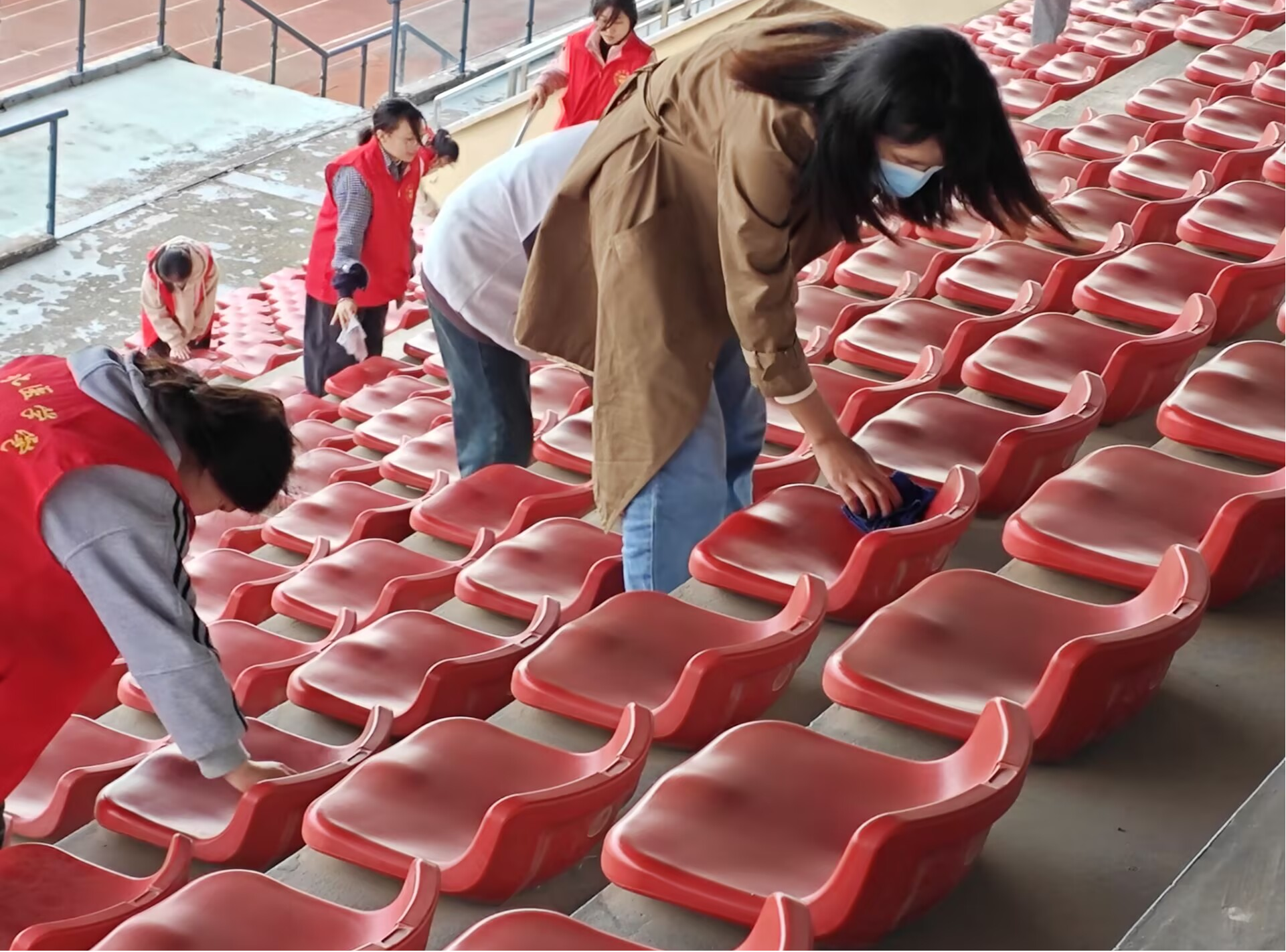 活动正式启动后,志愿者们手持扫帚、垃圾袋与清洁刷等工具,以饱满的热情投入清扫工作。面对宽广的看台与繁杂的垃圾,大家毫无畏色,迅速明确分工:有人专注擦拭座椅,细致清除表面尘埃与遗留杂物;有人俯身清理台阶,耐心捡拾缝隙中藏匿的纸屑;还有人专门负责垃圾的收集与搬运,现场秩序井然。