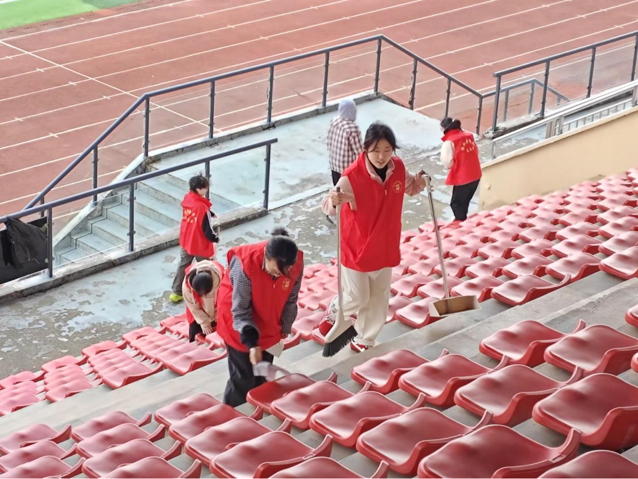 志愿者常佳怡感慨道:“之前看台上斑驳的污渍像一块块‘牛皮癣’,我们亲手把它们‘治愈’了。阳光洒下来,连风都带着清爽的味道。原来‘奉献’不是遥远的口号,就是弯一次腰、擦一把椅、抬一次头时,心里忽然涌起的踏实感。下次活动,我还报名!”
