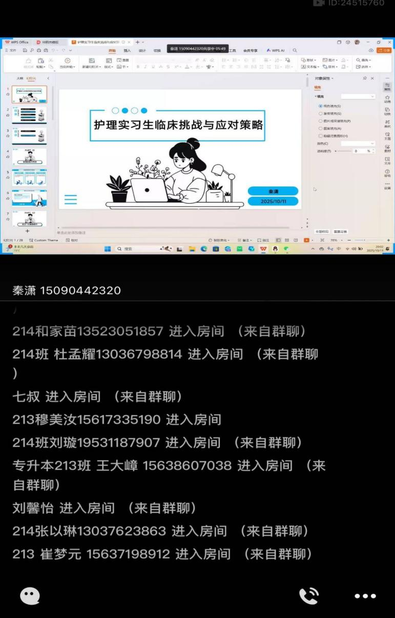 10月11日,2024级护理学专业专升本213班-214班学生在秦潇老师的带领下,于线上QQ会议开展了以“临床实习问题指导”为主题的学业指导会议。本次会议旨在为实习学生解答临床实习中的各类问题,助力他们明确临床实习的努力方向,提升实习质量。会议伊始,秦潇老师讲解操作类问题,强调规范是核心,如静脉穿刺失败的处理及无菌操作要点。紧接着,秦潇老师又讲解沟通类问题,强调共情,如应对患者不配合治疗的沟通方法。最后,秦潇老师讲解应急类问题,强调先救命,如患者突发晕厥、输液反应的处理流程。通过本次指导,同学们对临床实习中各类问题的应对有了更全面清晰的认识,明确了努力方向,为顺利开展护理实习工作、提升临床护理能力奠定了基础。