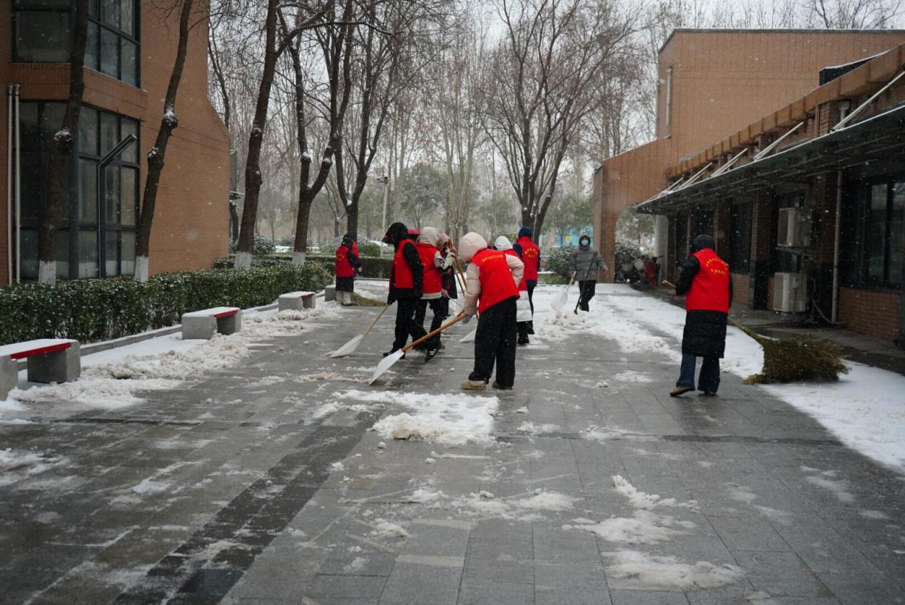 由学生会成员、青志联志愿者及党员发展对象组成的小队,冒着寒风、踏着积雪,纷纷拿起铁锹、铲子、扫帚等工具,迅速投入到清扫积雪的行列中,对书院内主要道路开展铲雪除冰活动。张志堃老师现场部署任务:“大家分成两组,一组负责清扫主干道积雪,二组铲除结冰路段。务必注意安全,相互配合!”