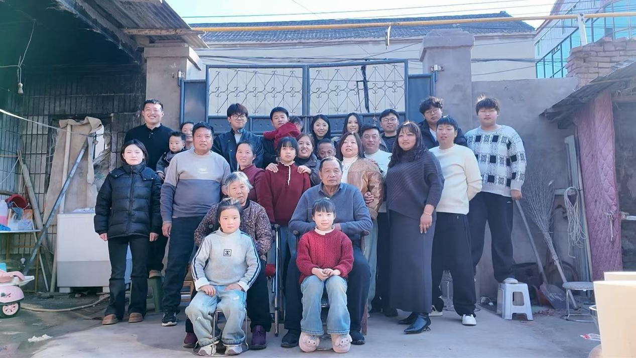 “画面中,我们全家二十多口人整整齐齐地聚在一起,姥姥姥爷坐在最中间,脸上是藏不住的笑意。我紧紧依偎在他们身边,能清晰地感受到姥姥粗糙却温暖的手掌,和姥爷沉稳有力的肩膀。身后是熟悉的铁门和老房子,阳光洒下来,把每个人的笑容都照得格外明亮。这是我们家难得的大团圆,平时大家分散在各地,只有过年才能像这样热热闹闹地聚在小院里。姥姥总说,人齐了,年才完整;姥爷总说,看到我们都好好的,他就放心了。按下快门的那一刻,我忽然懂得,全家福的意义,从来不是一张照片,而是把所有的思念、牵挂和爱,都定格在这方寸之间。它提醒我,无论走多远,家永远是最温暖的港湾;无论遇到什么,姥姥姥爷永远是我最坚实的依靠。这张全家福,就是我心中最圆满的新年。”