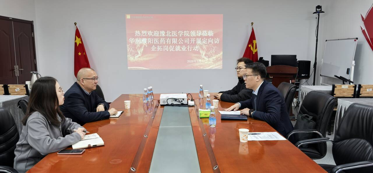为深入贯彻落实教育部及河南省教育厅关于2026届高校毕业生就业工作的决策部署,积极响应“优企引才”访企拓岗促就业专项行动号召,3月12日,豫北医学院德馨书院党委书记卢明臣一行赴华润濮阳医药有限公司开展定向走访与校企合作洽谈。公司总经理包志强、副总经理魏鑫、人力资源部经理李强强予以热情接待。